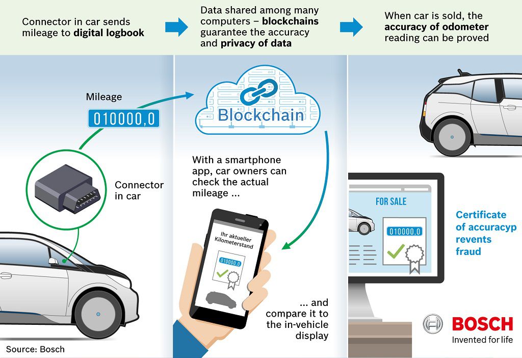 Denner je istaknuo jednu prakti?nu uporabu tehnologije blockchain putem demonstracije uživo u suradnji s njema?kim certifikacijskim tijelom TÜV Rheinland. Ta tehnologija jam?i da ?e stati na kraj raširenoj praksi prijevara s broja?em kilometara. Samo je u Njema?koj manipulacija broja?ima kilometara u vozilima prouzro?ila štetu od oko šest milijardi eura. Plan je boriti se protiv te prevarantske prakse s pomo?u digitalnog zapisnika distribuiranog na velik broj ra?unala. Automobili redovito šalju o?itanja sa svojih broja?a kilometara tim ra?unalima preko jednostavnog konektora. Putem aplikacije na pametnom telefonu vlasnici automobila mogu provjeriti stvarnu kilometražu u svakom trenutku i usporediti je s prikazom u vozilu. Ako žele prodati svoj automobil, može im se izdati potvrda kojom se potvr?uje to?nost kilometraže automobila. Tako?er je mogu?e podijeliti tu potvrdu na internetu, primjerice na internetskoj platformi za prodaju automobila.