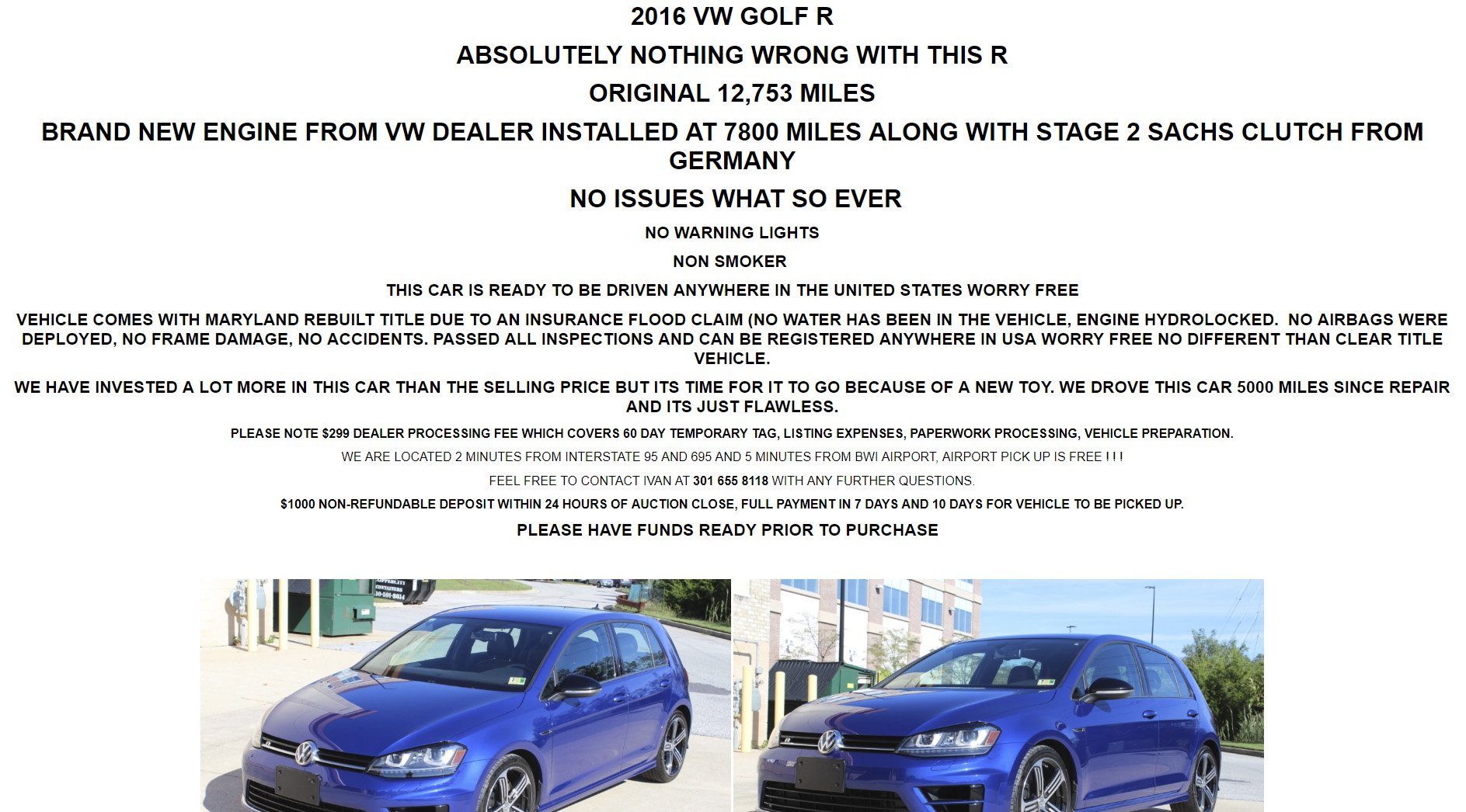 Veliku pažnju ovih dana privukao je oglas na eBayu kojim se prodaje Volkswagen Golf R iz 2016. godine, s prije?enih 20.500 km, za svega 19.500 eura.