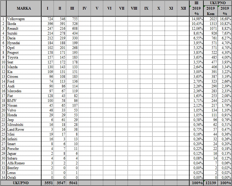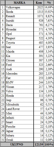 Me?u proizvo?a?ima uvjerljivo najbolji rezultat u ožujku postigao je Volkswagen s prodanih 755 vozila, slijedi Renault sa 608, Škoda sa 526, Suzuki sa 434, Dacia sa 330, Opel sa 268… Volkswagen je i kvartalni lider s prodanih 2025 vozila, ?ime drži tržišni udio od impresivnih 16,68 posto.