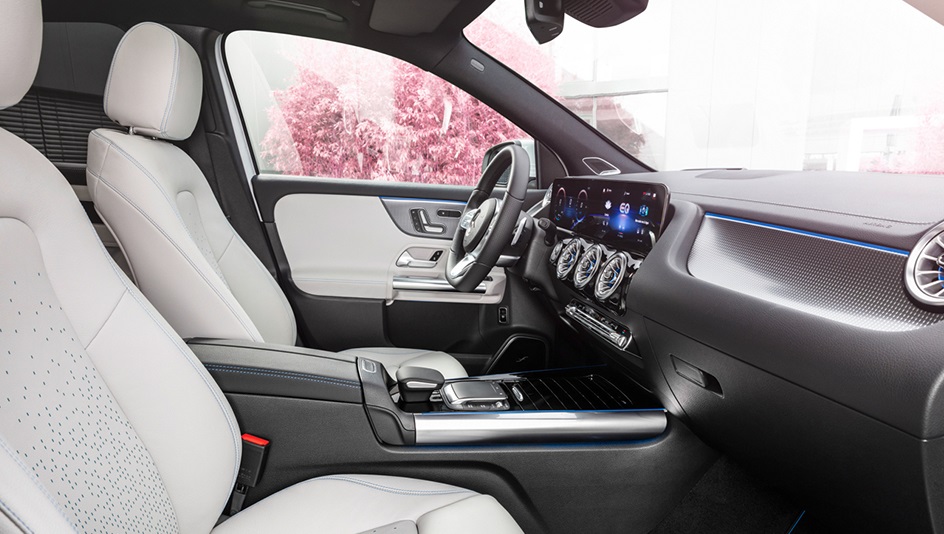 Postoje razne zna?ajke unutrašnjosti koje ukazuju na elektri?ni karakter EQA modela. Ovisno o liniji opreme, to može uklju?ivati unutrašnje elemente s pozadinskom rasvjetom – što predstavlja novost za Mercedes-Benz. Dodatni ekskluzivni detalji uklju?uju rosé zlatno obojane dekorativne elemente na ventilacijskim otvorima, sjedalima i klju?u vozila. Edition 1 specijalni model dodatno uklju?uje precizno perforirana kožom presvu?ena sjedala, kroz koju se može vidjeti tkanina u prepoznatljivoj Mercedes-EQ pure plavoj boji. Instrumenti, sa svojim specifi?nim prikazima za elektri?no vozilo, preuzeli su jednaku shemu boja s rosé zlatno obojanim i plavim istaknutim detaljima. Mercedes-EQ ikona na medijskom zaslonu može se koristiti za pozivanje izbornika koji se odnose na opcije punjenja, elektri?nu potrošnju i protok energije.