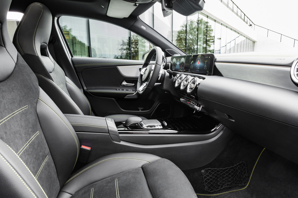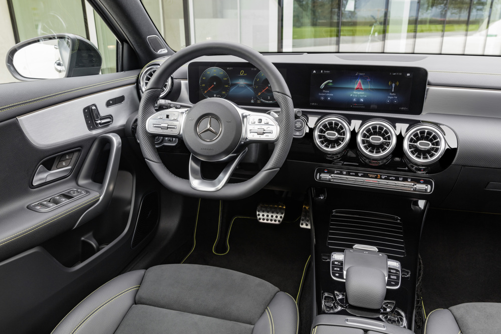 Unutrašnjost nove A-klase je potpuno redefinirana s njezinim modernim i avangardnim izgledom. Mercedes-Benz ima sasvim novi pristup, pokre?u?i revoluciju u kompaktnoj klasi s potpuno novim osje?ajem prostranosti unutrašnjosti. Jedinstvena unutrašnja arhitektura posebno je oblikovana avangardnim dizajnom prednje plo?e: po prvi put je uklonjen pokrov iznad instrumenata. Zahvaljuju?i tome, glavno tijelo prednje plo?e u obliku krila izdužuje se od jednih do drugih vrata bez vizualnog diskontinuiteta. Široki zaslon je u potpunosti samostoje?i. Dodatna istaknuta zna?ajka su ventilacijski otvori sa sportskim izgledom turbine.