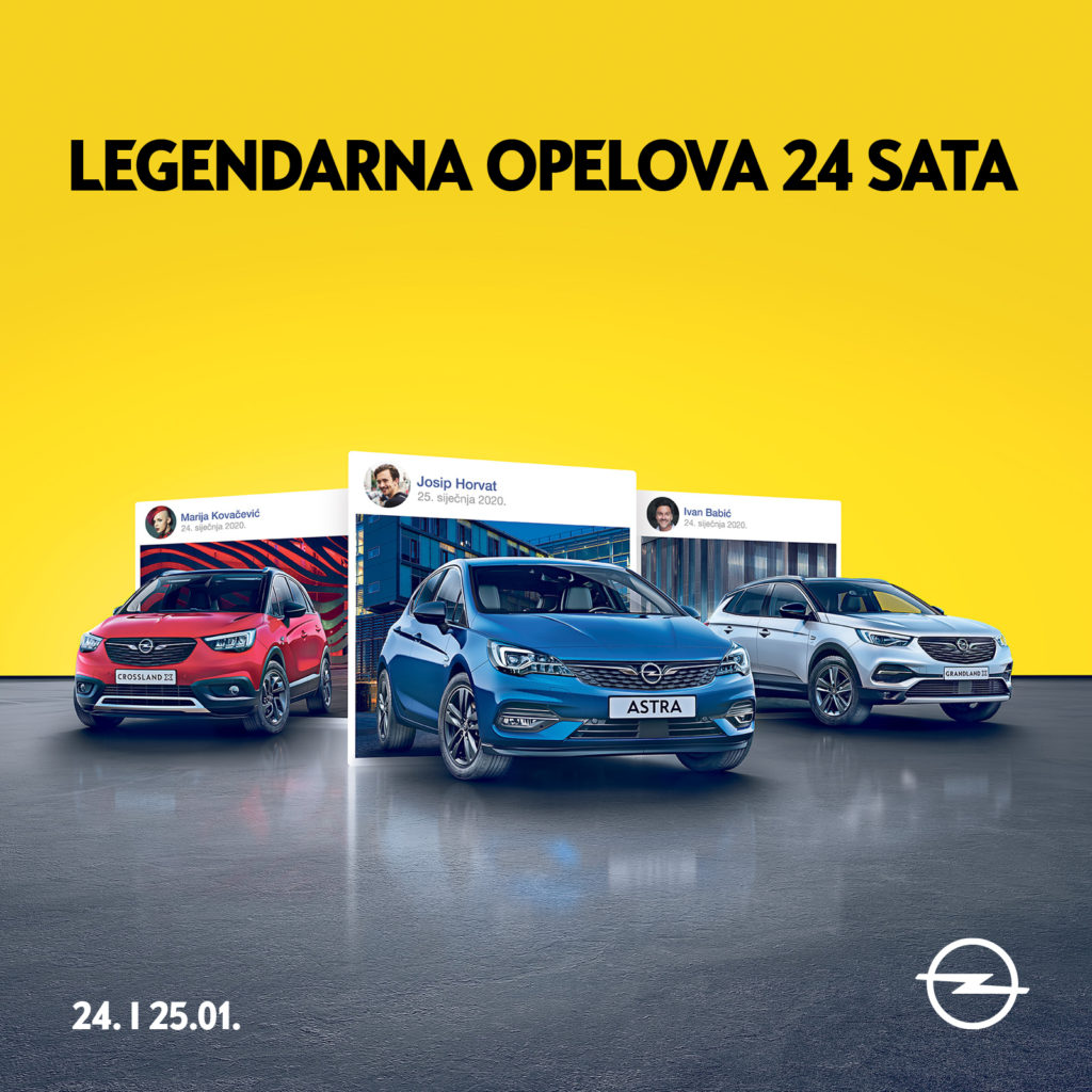 Legendarna akcija 24 sata, Opelov najisplativiji dan u godini, po?inje u petak 24. sije?nja u 12.00 sati i traje do subote 25. sije?nja u 12.00 sati. Svi Opelovi modeli ?e u tom periodu biti dostupni po neponovljivim cijenama. Ponuda se odnosi na putni?ka i gospodarska vozila i to za odmah dostupna vozila, kao i za vozila naru?ena prema specifikacijama kupaca.