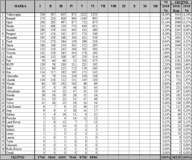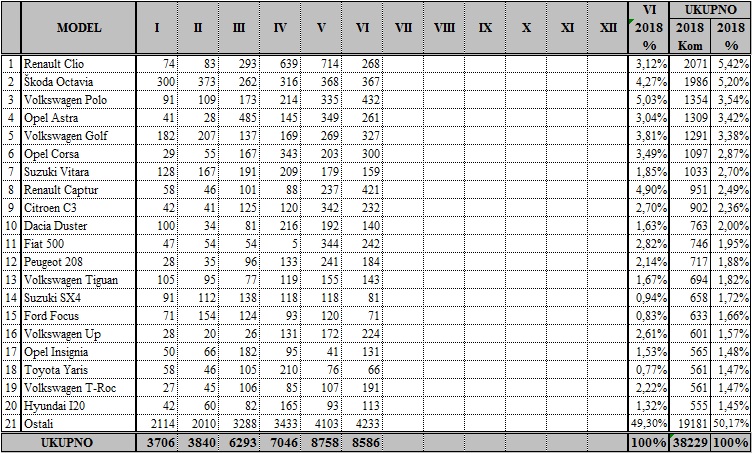 Najuspješniji proizvo?a? automobila u lipnju tradicionalno je bio Volkswagen, koji je prodao 1553 vozila, a slijede Renault sa 891, Opel sa 875, Škoda sa 651, Peugeot s 549, Ford s 519…