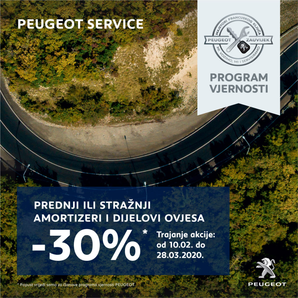 Peugeot je pripremio zimsku servisnu akciju za ?lanove kluba vjernosti Peugeot Zauvijek do 28. ožujka 2020. Uz standardne popuste koje ostvaruju ?lanovi kluba na dijelove za održavanje, ?lanovi sada ostvaruju poseban popust od 30 % na prednje i stražnje amortizere kao i dijelove ovjesa.