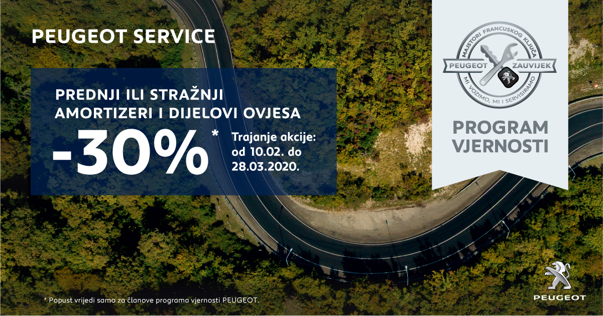 Peugeot je pripremio zimsku servisnu akciju za ?lanove kluba vjernosti Peugeot Zauvijek do 28. ožujka 2020. Uz standardne popuste koje ostvaruju ?lanovi kluba na dijelove za održavanje, ?lanovi sada ostvaruju poseban popust od 30 % na prednje i stražnje amortizere kao i dijelove ovjesa.