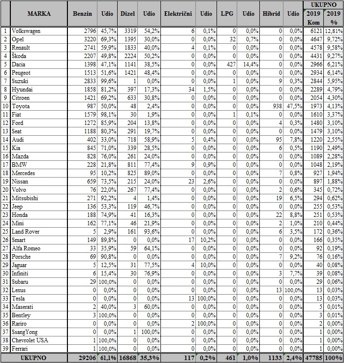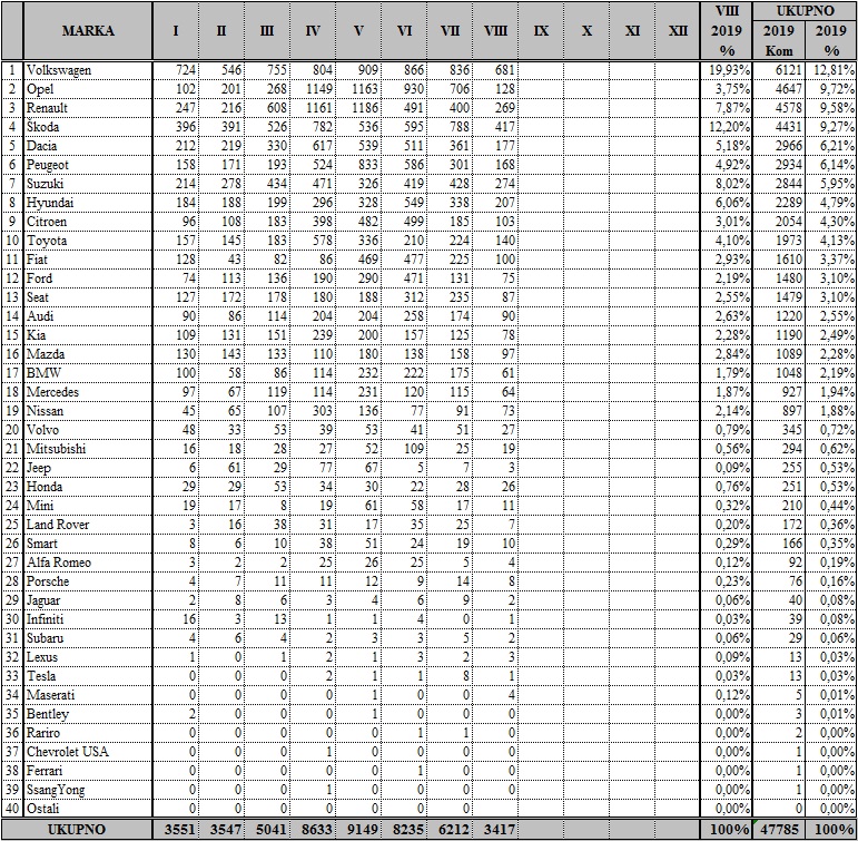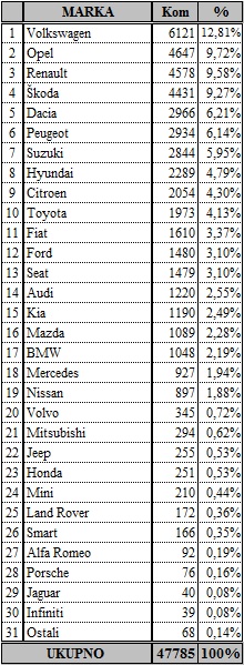 ?ak ?etiri modela Volkswagena u 10 najprodavanijih najbolji je pokazatelj popularnosti u Hrvatskoj. Volkswagen je uvjerljiv tržišni lider pa ih je u kolovozu prodano 681, drugoplasirana je Škoda sa 417, tre?i Suzuki sa 274, ?etvrti Renault sa 269, peti Hyundai sa 207, šesta Dacia sa 177, sedmi Peugeot sa 168, osma Toyota sa 140, deveti Opel sa 128, a deseti je Citroën sa 103 prodana primjerka.