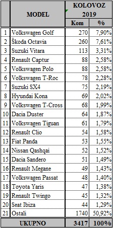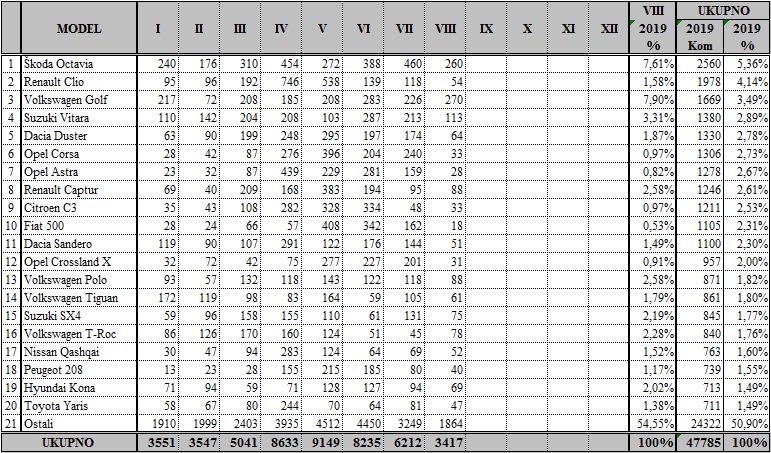 Pobjednik kolovoza je Volkswagen Golf sa 270 primjeraka, slijedi Škoda Octavia sa 260, Suzuki Vitara sa 113, Renault Captur i Volkswagen Polo sa 88, Volkswagen T-Roc sa 78, Hyundai Kona sa 69, Volkswagen T-Cross sa 68, a krug najprodavanijih 10 modela zatvara Dacia Duster sa 64 primjeraka.