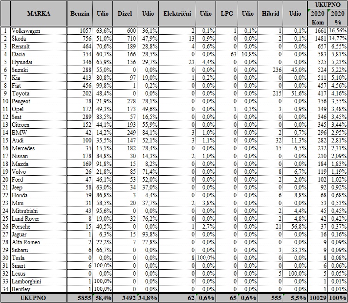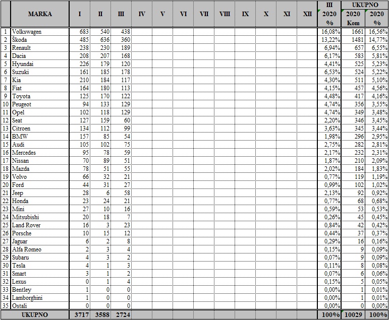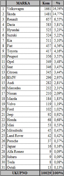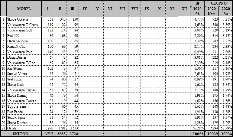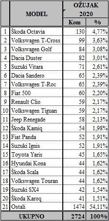 Volkswagen je i u ožujku bio tržišni lider, sa 438 prodanih vozila, na drugom mjestu je Škoda sa 360, a na tre?em Renault sa 189. Me?u modelima je najtraženija Škoda Octavia sa 130 prodanih automobila, slijedi Volkswagen T-Cross sa 99, a na tre?em mjestu je Volkswagen Golf sa 84.