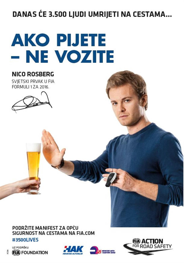 Svjetski prvak u FIA Formuli 1 za 2016. Nico Rosberg s porukom „ako pijete-ne vozite“ jer i najmanja koli?ina alkohola pove?ava rizik od sudjelovanja u prometnoj nesre?i sa smrtnim posljedicama. Procjenjuje se da je alkohol povezan s tre?inom svih prometnih nesre?a sa smrtnim posljedicama u svijetu. Da biste bili sigurni, koristite taksi ili javni prijevoz ili potražite prijatelje koji nisu konzumirali alkohol.