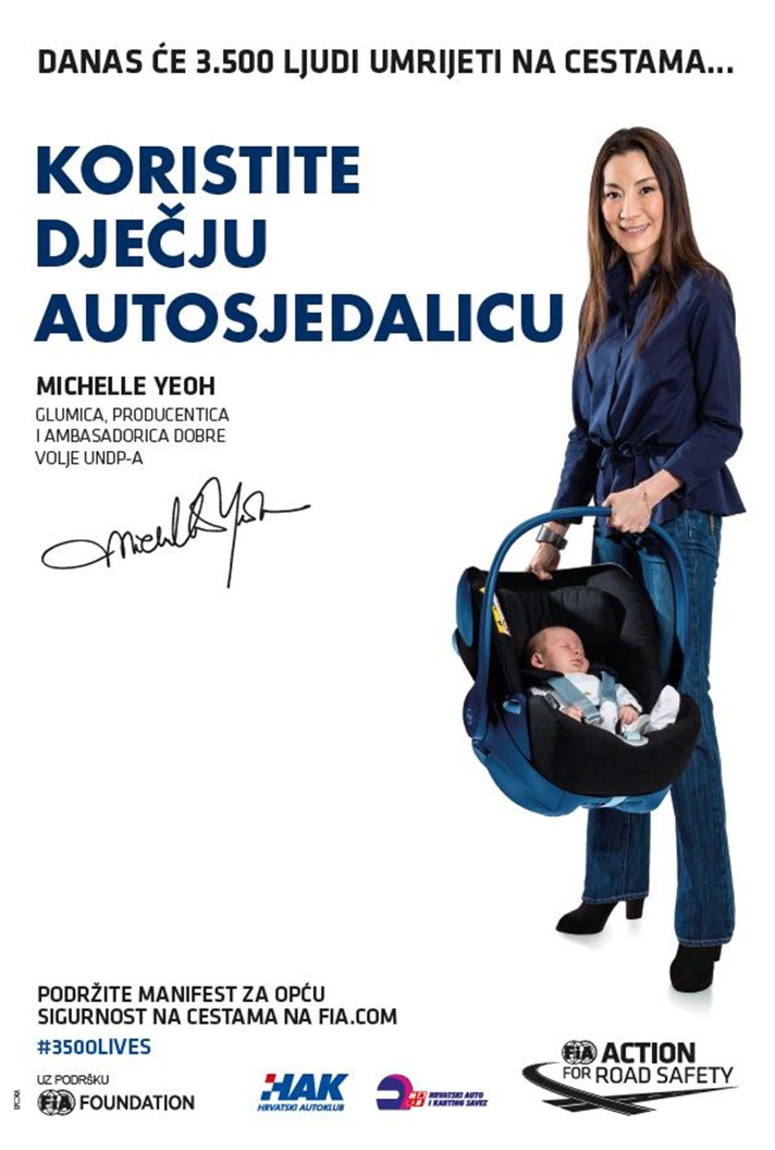 Glumica, producentica i ambasadorica dobre volje Razvojnog programa UN-a Michelle Yeoh s porukom „koristite dje?ju autosjedalicu“ jer nevjerojatno velik broj roditelja dozvoljava svojoj djeci putovanje u vozilu bez korištenja autosjedalice ili sigurnosnog pojasa i time im ugrožava sigurnost i živote. Dje?je autosjedalice mogu do 70 posto umanjiti opasnost od smrtnog stradavanja djece u prometnoj nesre?i. Zato koristite dje?ju autosjedalicu i sigurnosni pojas te birajte autosjedalicu prema visini ili težini djeteta.