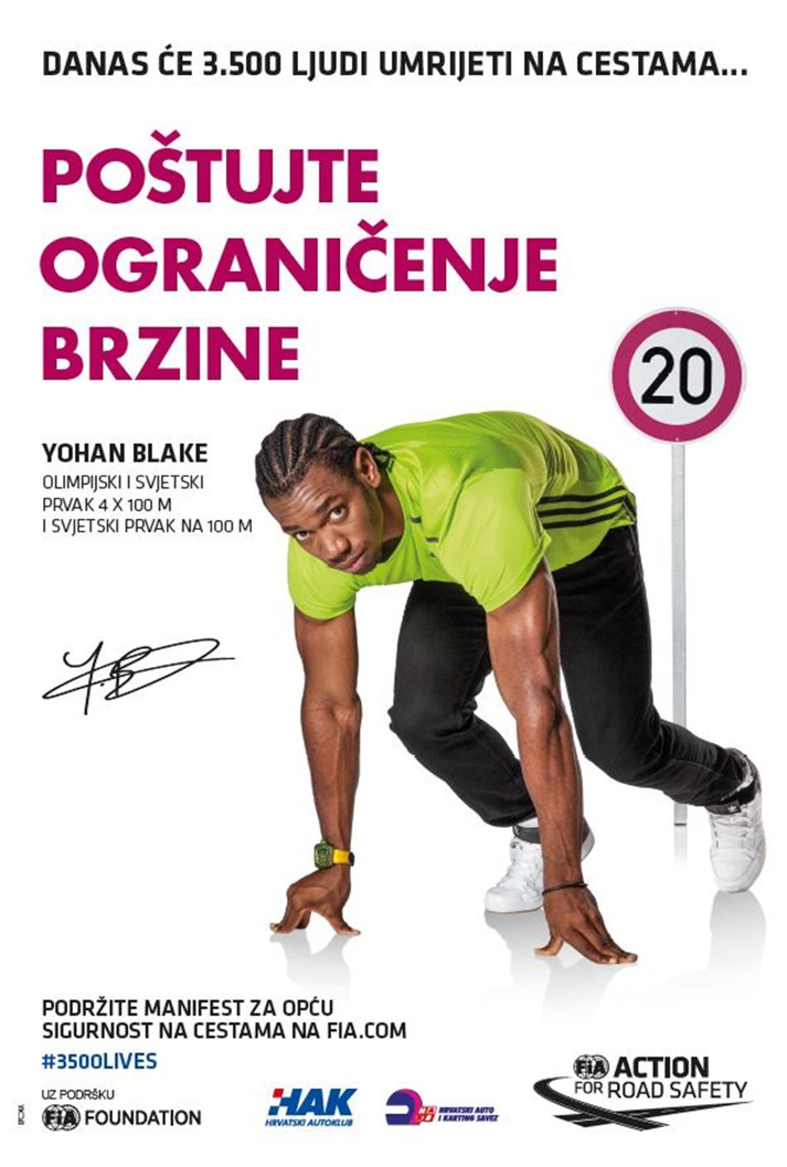 Olimpijski i svjetski prvak na 4×100 m i svjetski prvak na 100 m Yohan Blake s porukom „poštuj ograni?enje brzine“ jer je brzina jedan od glavnih uzroka prometnih nesre?a sa smrtnim posljedicama. Smanjenje prosje?ne brzine od samo pet posto može za 30 posto smanjiti broj prometnih nesre?a sa smrtnim posljedicama. Zato usporite u zonama visokog rizika i okolici škola te održavajte sigurnosni razmak od ostalih sudionika u prometu.