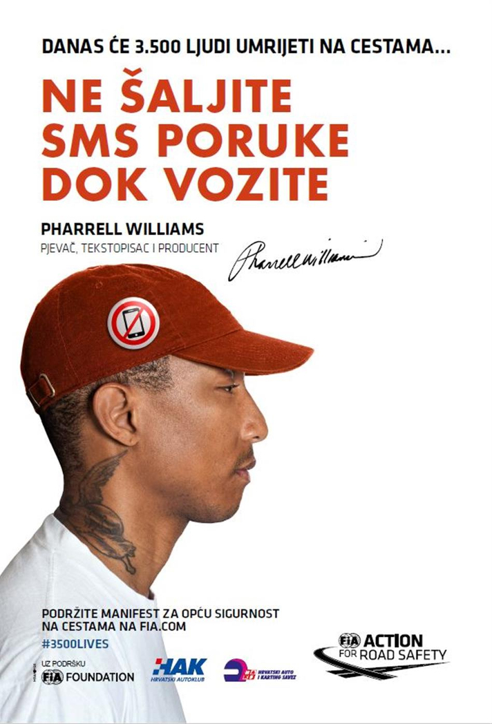 Pjeva?, tekstopisac i producent Pharrell Williams s porukom „ne šaljite sms poruke dok vozite“ jer popuštanje koncentracije od samo jedne sekunde može izazvati nesre?u sa smrtnim posljedicama. Voza?i koji koriste mobitel tijekom vožnje imaju ?etiri puta ve?u šansu izazvati nesre?u. Zato držite obje ruke na volanu i fokusirajte se na cestu.