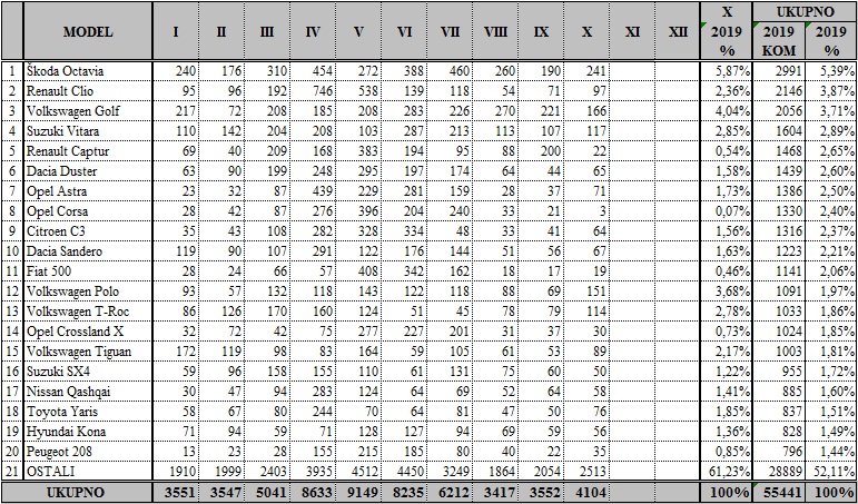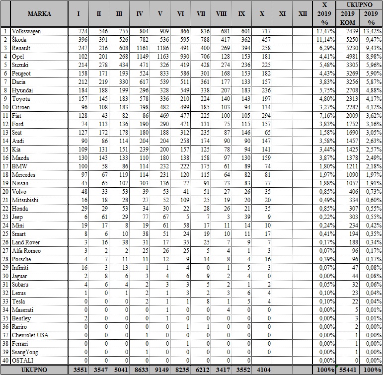 Naime, u prvih 10 mjeseci teku?e godine prodano je 55.441 novih automobila, odnosno 2,52 posto više nego i istom razdoblju prošle godine.