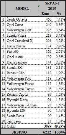 Uvjerljivo najtraženiji model u srpnju bila je Škoda Octavia sa 460 primjeraka, slijede Opel Corsa sa 240, Volkswagen Golf sa 226, Suzuki Vitara sa 213, Opel Crossland X sa 201, Dacia Duster sa 174…
