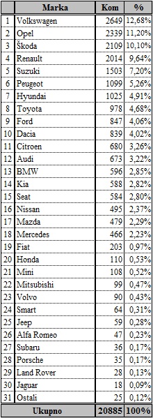 Me?u modelima je uvjerljivo prvo mjesto osvojio Renault Clio sa 639 primjeraka, a slijedi Opel Corsa s 343, Škoda Octavia s 316, pa Dacia Duster s 216, Volkswagen Polo s 214…