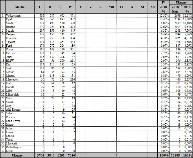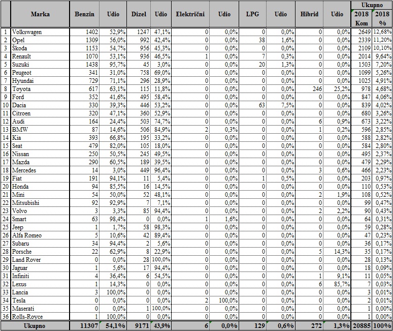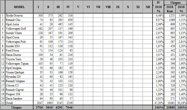 Nakon prva ?etiri mjeseca 2018. godine me?u proizvo?a?ima je u vodstvu Volkswagen, a slijede Opel i Škoda, dok me?u modelima vodi Škoda Octavia, drugi je Renault Clio, a tre?a Opel Astra.