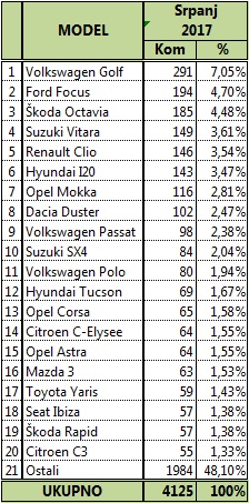 Nakon što je u lipnju zasjao Renault Clio, u srpnju je uvjerljivo najprodavaniji automobil u Hrvatskoj bio Volkswagen Golf, a drugi je Ford Focus. Škoda Octavia je na tre?em mjestu, ?etvrti je Suzuki Vitara, a tek na petom mjestu je Renault Clio. Me?u proizvo?a?ima tradicionalno je lider Volkswage, drugo mjesto drži Škoda, tre?i je Suzuki, ?etvrti Opel, a peti Renault. Ono što je važno istaknuti je da je Suzuki najpopularniji me?u privatnim kupcima. Model Vitara ve? je mjesecima tržišni hit.