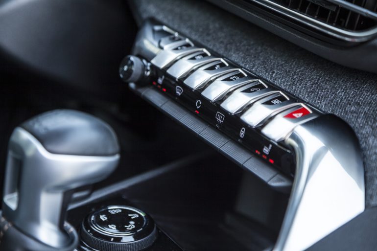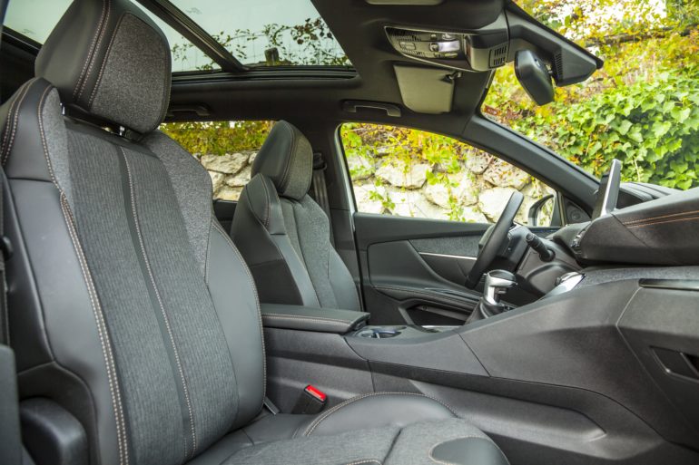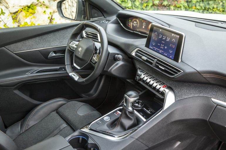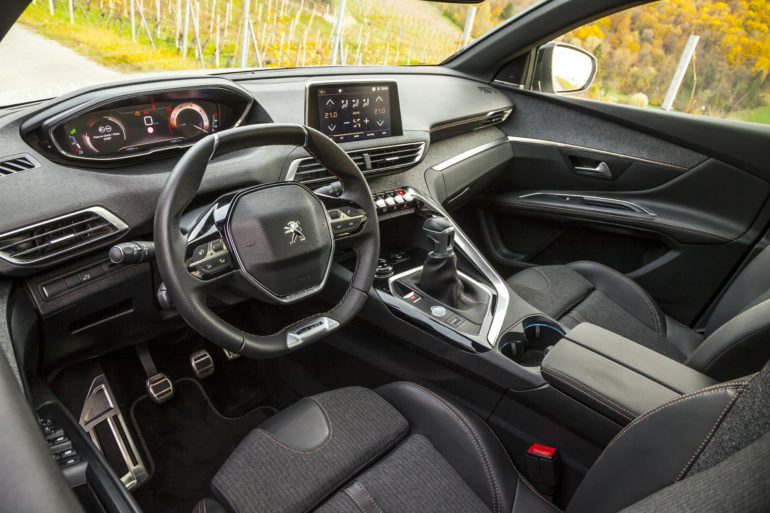 Komforna unutrašnjost straga, sprijeda se pretvara u sportski šik s, ve? tradicionalnim, visoko podignutim instrumentima i volanom malog promjera. Izborom materijala osjetno je napredovao, a sva sila gadgeta odaje dojam vožnje za u klasu ve?em modelu. Luksuzna armatura, s detaljima od aluminija, prili?no koketira sa sportom. Druga generacija i-Cockpita uklju?uje instrumentnu plo?u dijagonale 12,3 in?a te 8-in?ni središnji zaslon, osjetljiv na dodir.