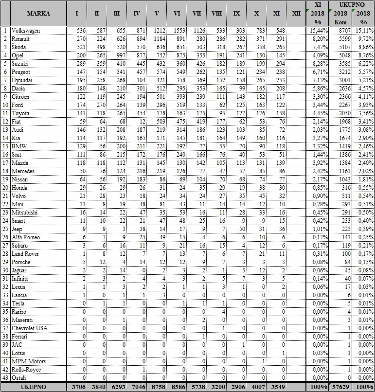 To je tek neznatno bolje nego u studenom 2017. godine kad ih je prodano 3496, ali na godišnjoj razini porast je i dalje solidan. Naime, u prvih 11 mjeseci teku?e godine prodano je 57629 automobila, što je zna?ajnih 18,52 posto više nego lani. Usporavanje rasta prodaje samo je dokaz da su u ukupnoj brojci novoregistriranih vozila privatni kupci u manjini.